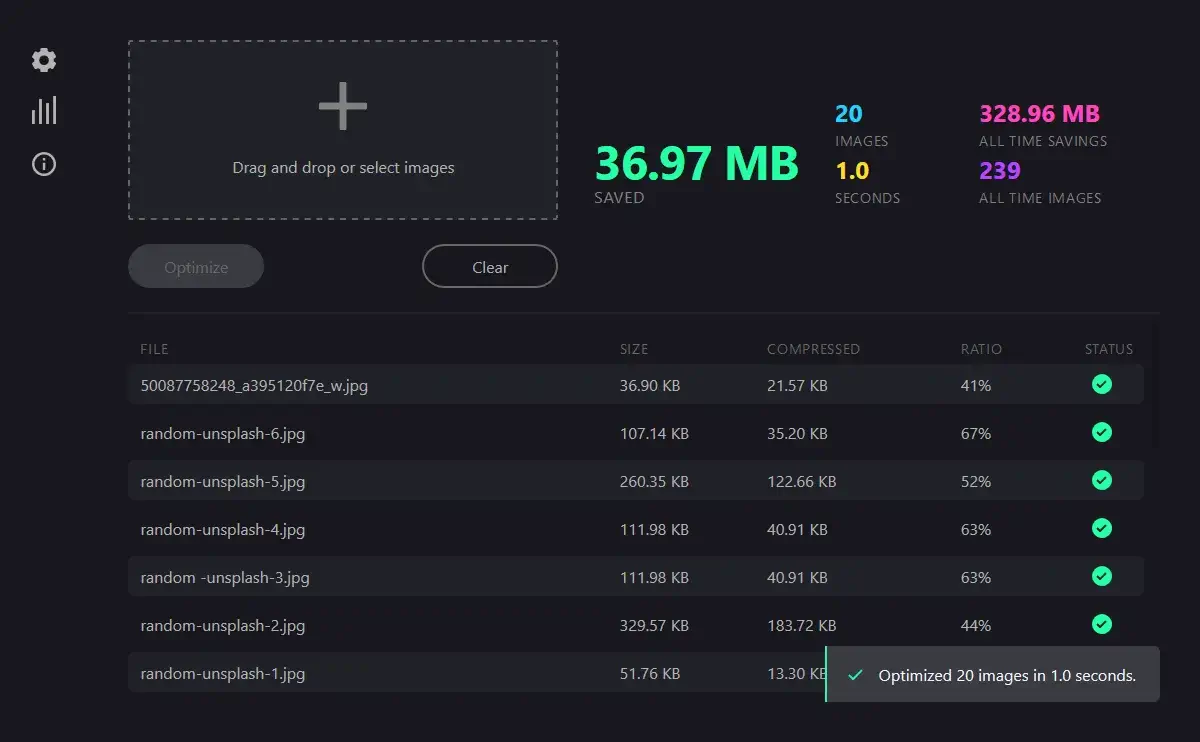 Optimus 데스크탑 이미지 최적화 애플리케이션입니다. WebP, JPEG, PNG 이미지 포맷 형식간의 변환 및 압축을 지원합니다.