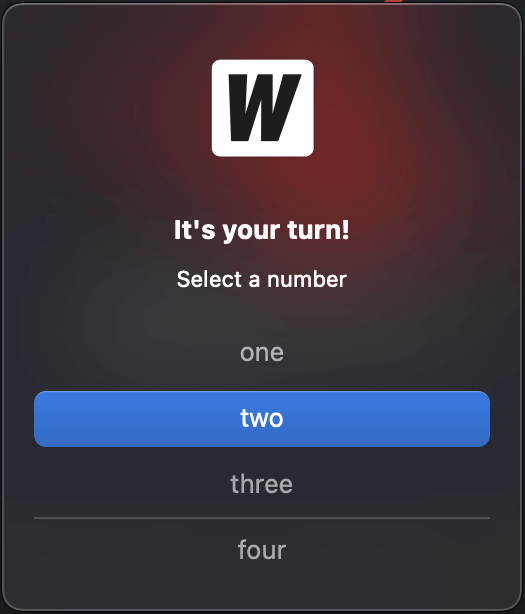 the button with "three" is shown at the bottom of the dialog. When escape is pressed, the value "three" is returned: